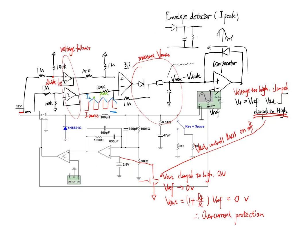 A comparator compares this peak voltage to a reference voltage: when the current is too high, V+ > Vref, then Vout turns high.