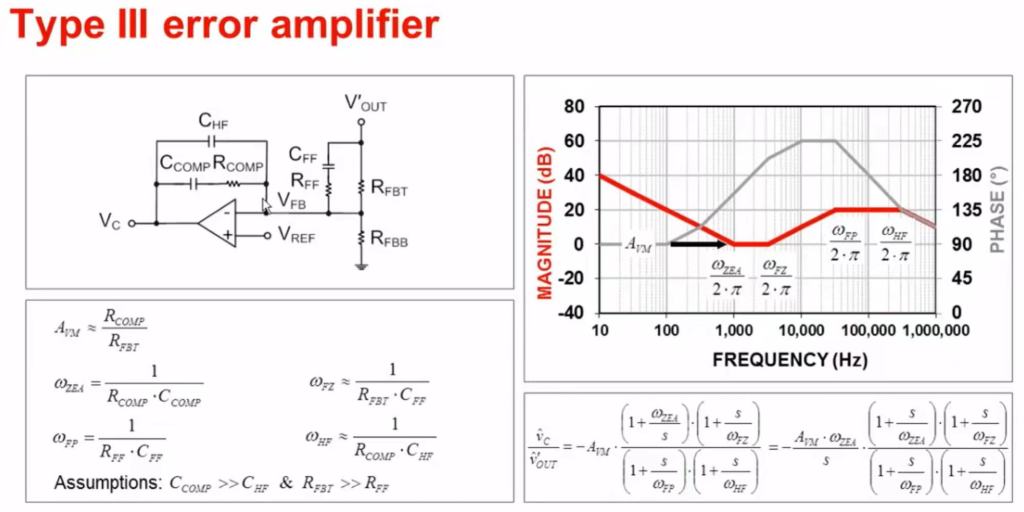 This design adopts the Type III error amplifier topology, following a well-established compensation structure from Texas Instruments’ reference designs [2]. The Type III compensator provides: