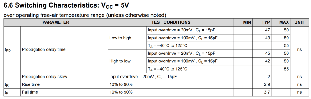 At a switching frequency of 145 kHz (PWM period ≈ 6.9 µs), the comparator must settle much faster than one cycle to avoid duty distortion. Following the common rule of keeping the propagation delay less than 1/10 of the PWM period, the requirement is tpd< 0.69 µs. TLV3201 operates in nano-seconds, therefore meets this requirement [1].