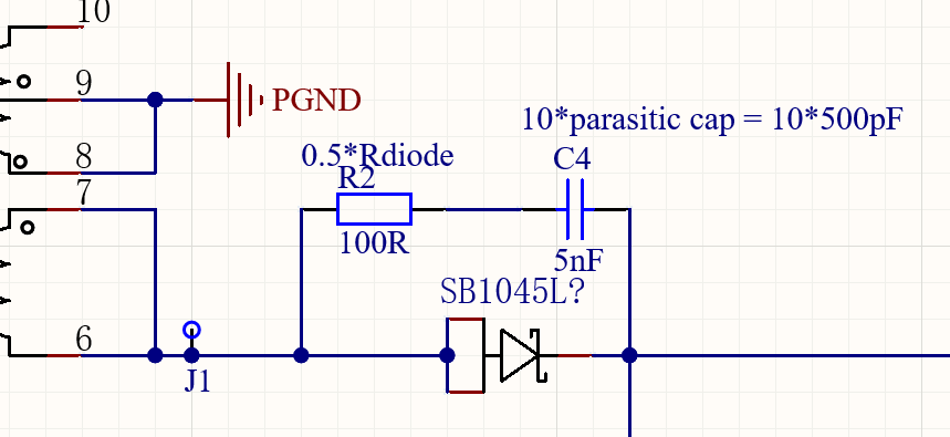 To mitigate this, I added an RC snubber directly across the diode. Following a common design heuristic: